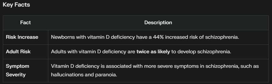 Vitamin D, often called the “sunshine vitamin,” is crucial for brain health, influencing neuroplasticity, neurotransmitter production, and inflammation regulation. Low vitamin D levels are common in schizophrenia, with a 2014 review noting that individuals with insufficient levels were more than twice as likely to have the condition. Babies born with low vitamin D also face a 44% higher risk of developing schizophrenia later in life, highlighting its role in early brain development.